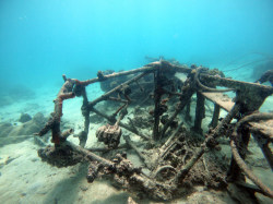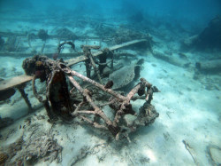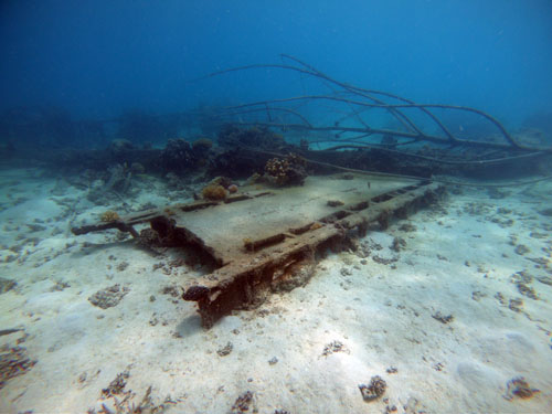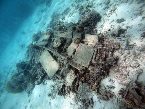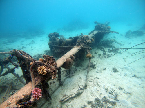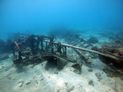 ガラパンのアメリカンメモリアルパーク沖合・水深6メートルに、不明な飛行機が沈んでいます。外壁はすでに無くなっていますが、骨組みはしっかり残されています。