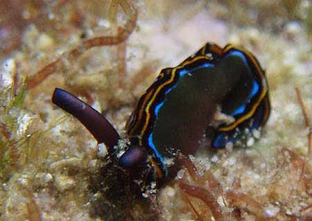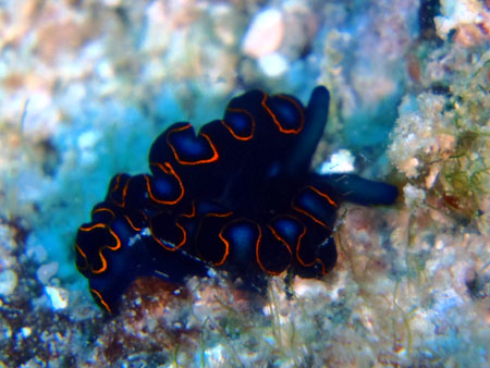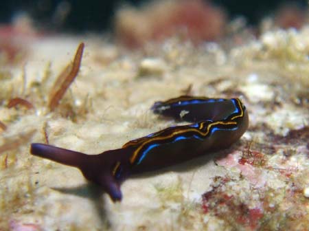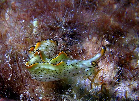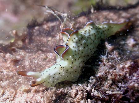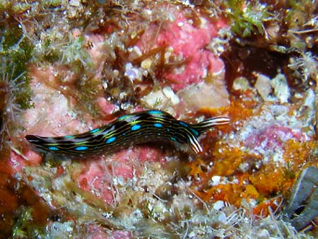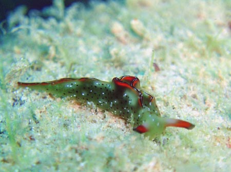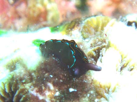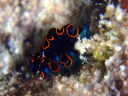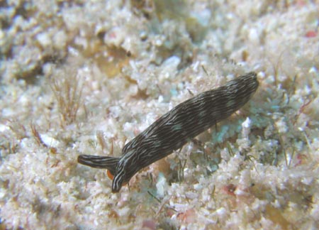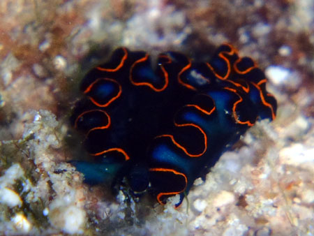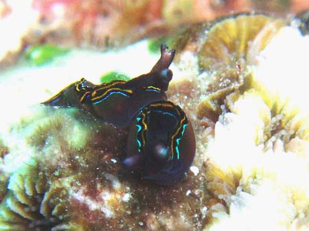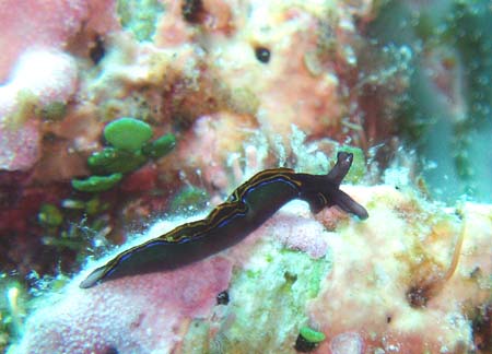 はじめは、ヒラムシと思って適当に撮影したが、画像を大きくしてみるとウミウシだった、側足縁を波打たせる事が多い種です。